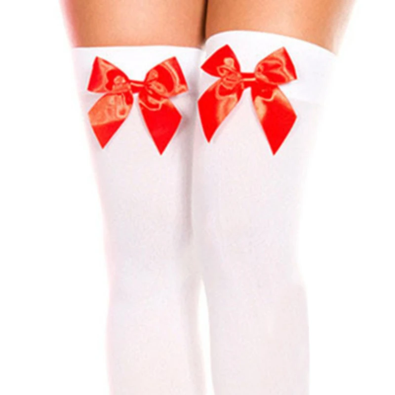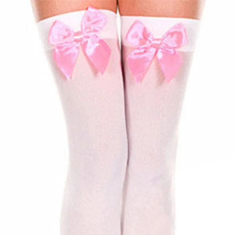 Available in classic white or sleek black bases with matching or contrasting bow colors (pink, red, black)—ideal for lolita outfits, schoolgirl cosplay, short skirts, lingerie sets, or adding a sweet touch to any ensemble. The thigh-high length flatters legs and stays comfortably in place.