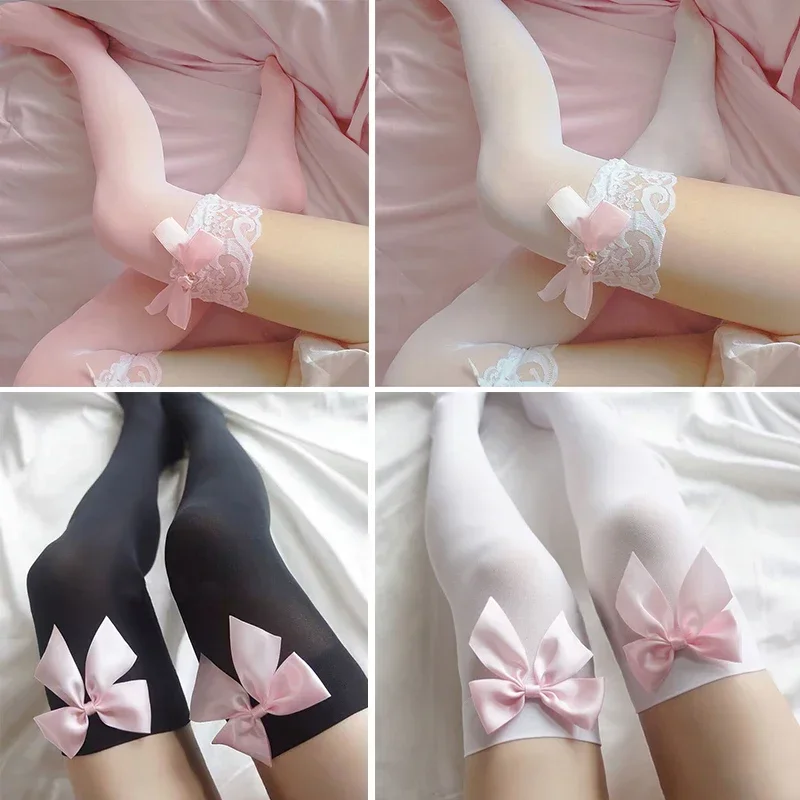 Cute Pink Bow Thigh-High Stockings with Lace Trim – Sweet Over-Knee Sheer Socks for Women (White & Black)