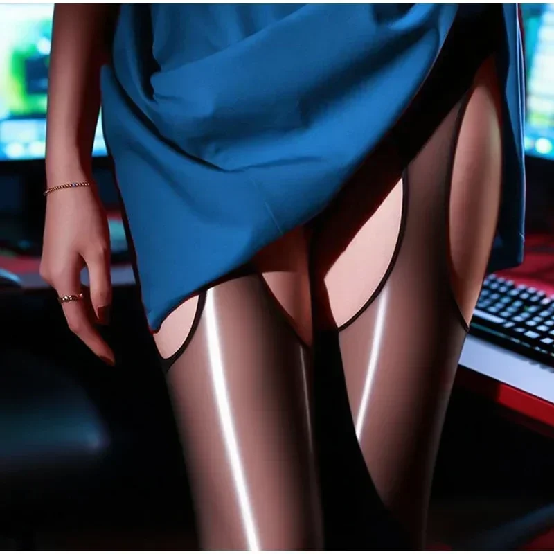 Command attention with these ultra-glossy thigh-high stockings, featuring a slick oil sheen finish that mimics wet-look latex for irresistible shine and allure. The innovative four-sided hollow-out design creates daring cutouts at the thighs, blending seduction with edgy sophistication in a seamless, thin fabric that’s lightweight and form-fitting.