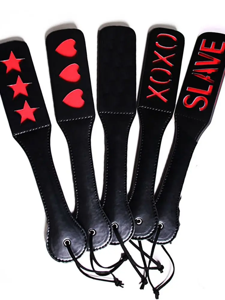 - Paddle surface features hollow-carved designs with multiple patterns: triple red hearts, XOXO, four stars, SLAVE — strong visual contrast between cute and submissive