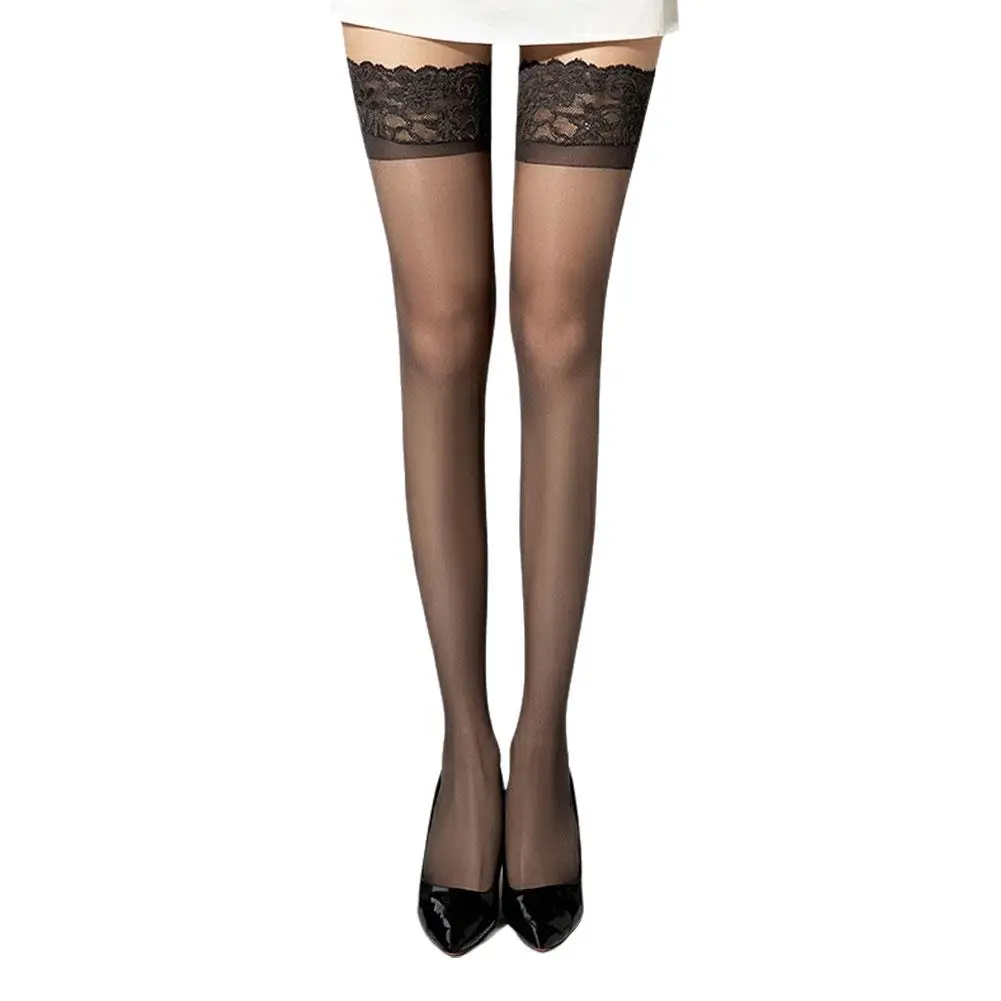 Slip into these lace top silicone non-slip thigh high stockings and feel the instant seductive hug. The delicate floral lace tops with built-in powerful silicone grips hold them securely in place all day or night—no slipping, no garters needed. The ultra-thin sheer fabric glides on like a second skin, creating a smooth, transparent glow that slims, lengthens, and makes your legs irresistibly tempting. Breathable and lightweight, they’re perfect for summer heat, under skirts or as standalone naughty lingerie.