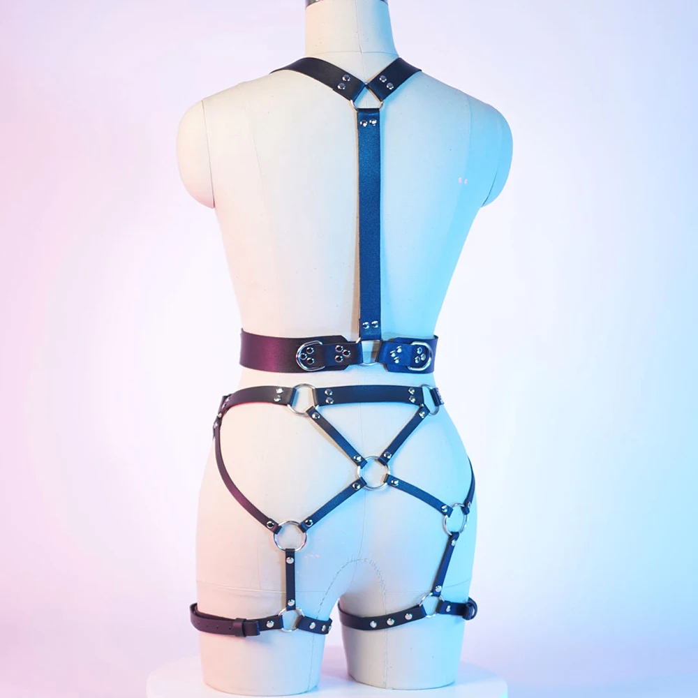 This leather full-body harness garter belt uses minimalist yet powerful intersecting lines to dramatically accentuate waist, hips and thigh curves. It’s both a visually explosive photography piece and a very practical prop for light-to-medium restraint and power play.
