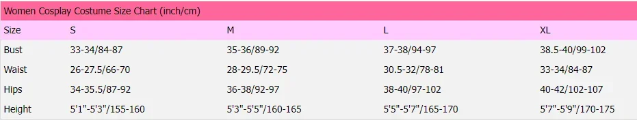 | Women Cosplay Costume Size Chart (inch/cm) | ||||