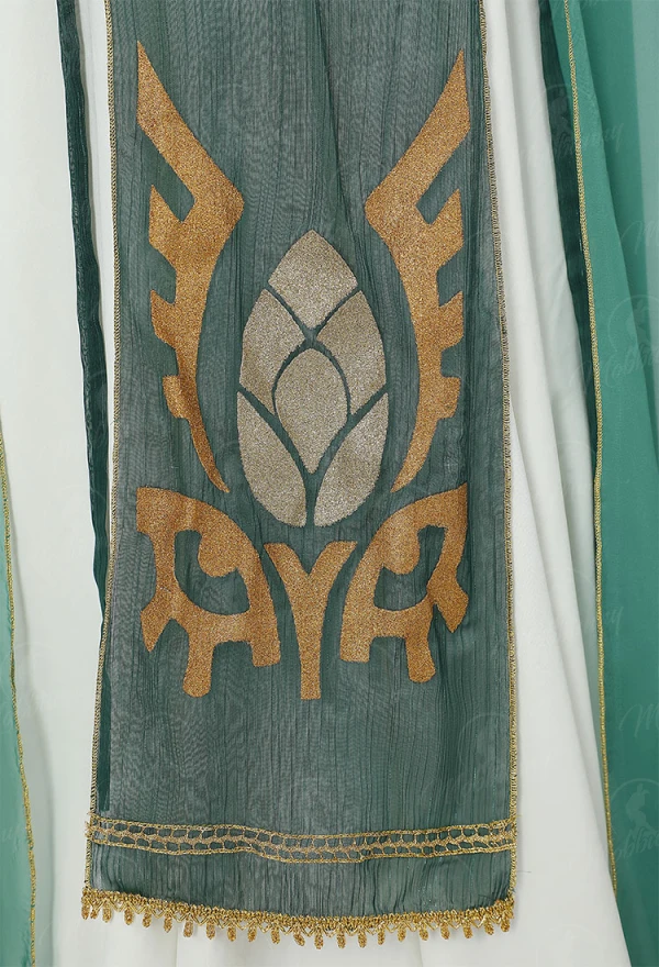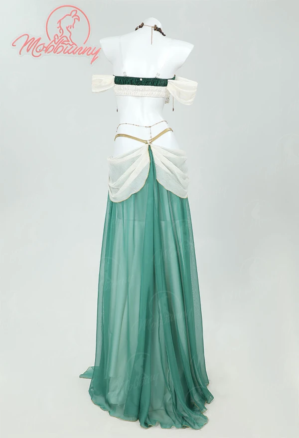 Unleash ethereal fantasy allure with this stunning Princess Zelda-inspired dance lingerie set, blending royal elegance and seductive dance style. The short top features intricate gold accents and tassels, paired with a flowing teal-green sheer skirt, detachable shawl ribbons, ornate headpiece, and statement necklace for a complete regal yet provocative look. Perfect for cosplay events, themed photoshoots, Halloween, role-play, or adding fantasy flair to intimate moments—breathable fabrics, adjustable elements, and flattering design ensure comfort and confidence.