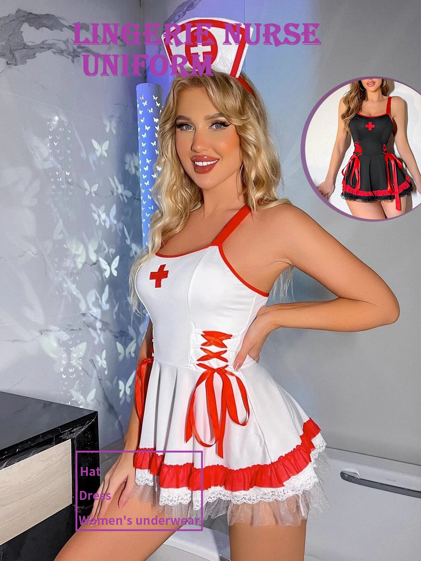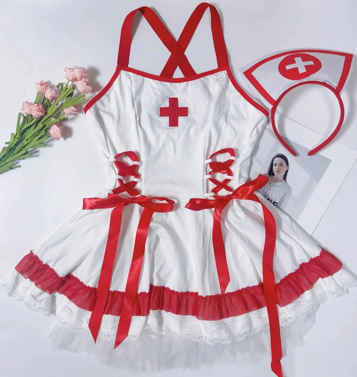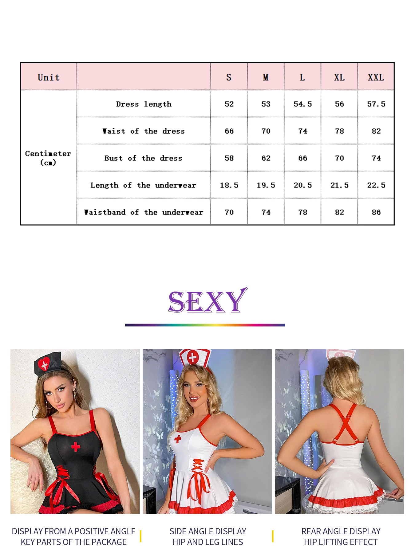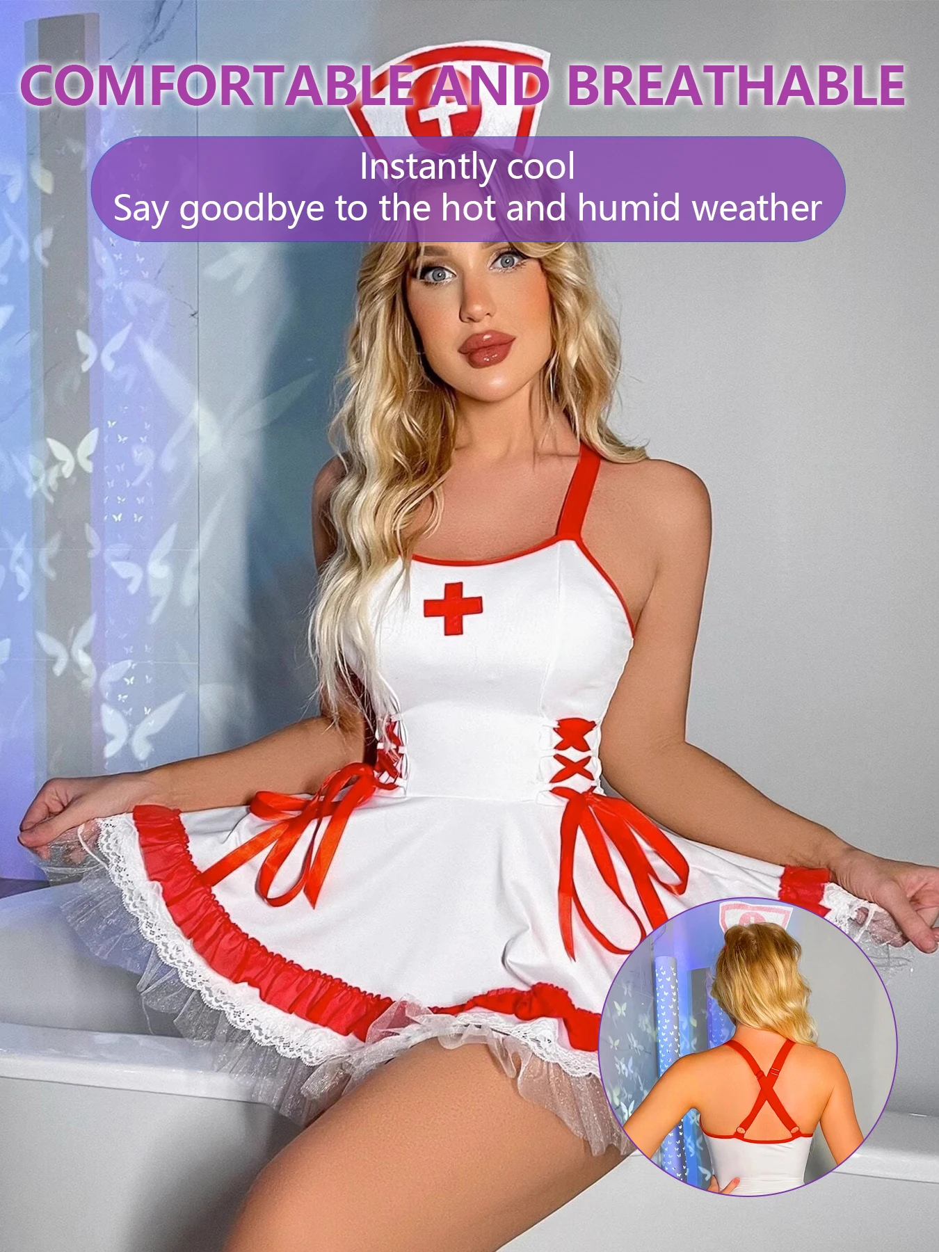 Turn up the heat with this seductive backless nurse lingerie set, blending flirty innocence and bold temptation. The halter-style mini dress features embroidered lace cups, a striking red cross and ribbon tie at the bust, crisscross open-back straps for eye-catching allure, and a ruffled skirt with red trim for playful movement. Complete with a classic nurse cap, it’s designed in lightweight, breathable fabric that feels instantly cool and comfortable—perfect for summer nights, bedroom role-play, intimate fantasies, Halloween parties, or adding spice to your lingerie collection.