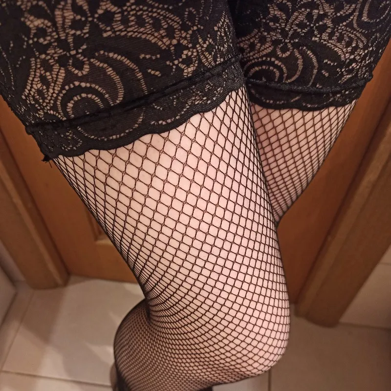 These sexy fishnet lace silicone non-slip thigh high stockings feature classic large-mesh fishnet for maximum transparency and teasing allure in black, topped with delicate lace ruffles and wide silicone grip band for secure, no-roll-down fit on thighs without digging in — comfortable for extended wear. The net design elongates and slims legs for a tall, straight, and flawlessly seductive look. Great stretch, breathable, and soft feel — perfect for pairing with mini skirts, dresses, erotic lingerie, role-play (maid/student/goth/dark lolita vibes), cosplay shoots, or intimate bedroom surprises. Discreet, unmarked packaging with no explicit wording ensures complete privacy. Whether to amp up everyday spice or ignite couple passion, achieve irresistible “fishnet leg model” allure!