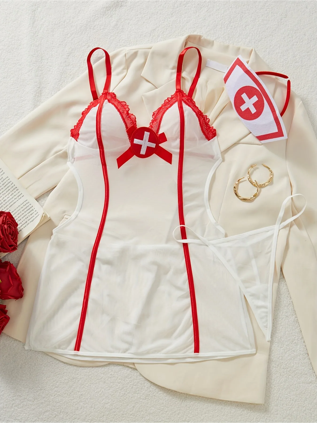 Ignite playful passion with this teasing sheer mesh naughty nurse set, featuring a white cami-style mini dress accented by bold red straps, cross bow details, and delicate lace trims for irresistible see-through allure. Includes a matching thong and classic nurse hat to complete the seductive “white angel with a naughty twist” vibe. Perfect for intimate nights, role-play fantasies, Valentine’s surprises, Halloween parties, or themed photoshoots—lightweight, breathable mesh hugs curves comfortably while delivering flirty confidence and temptation.