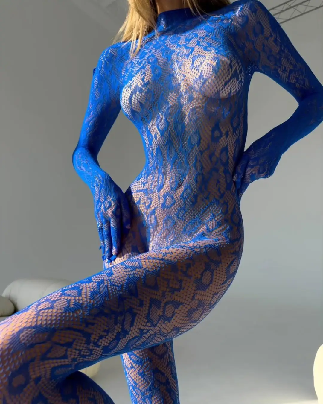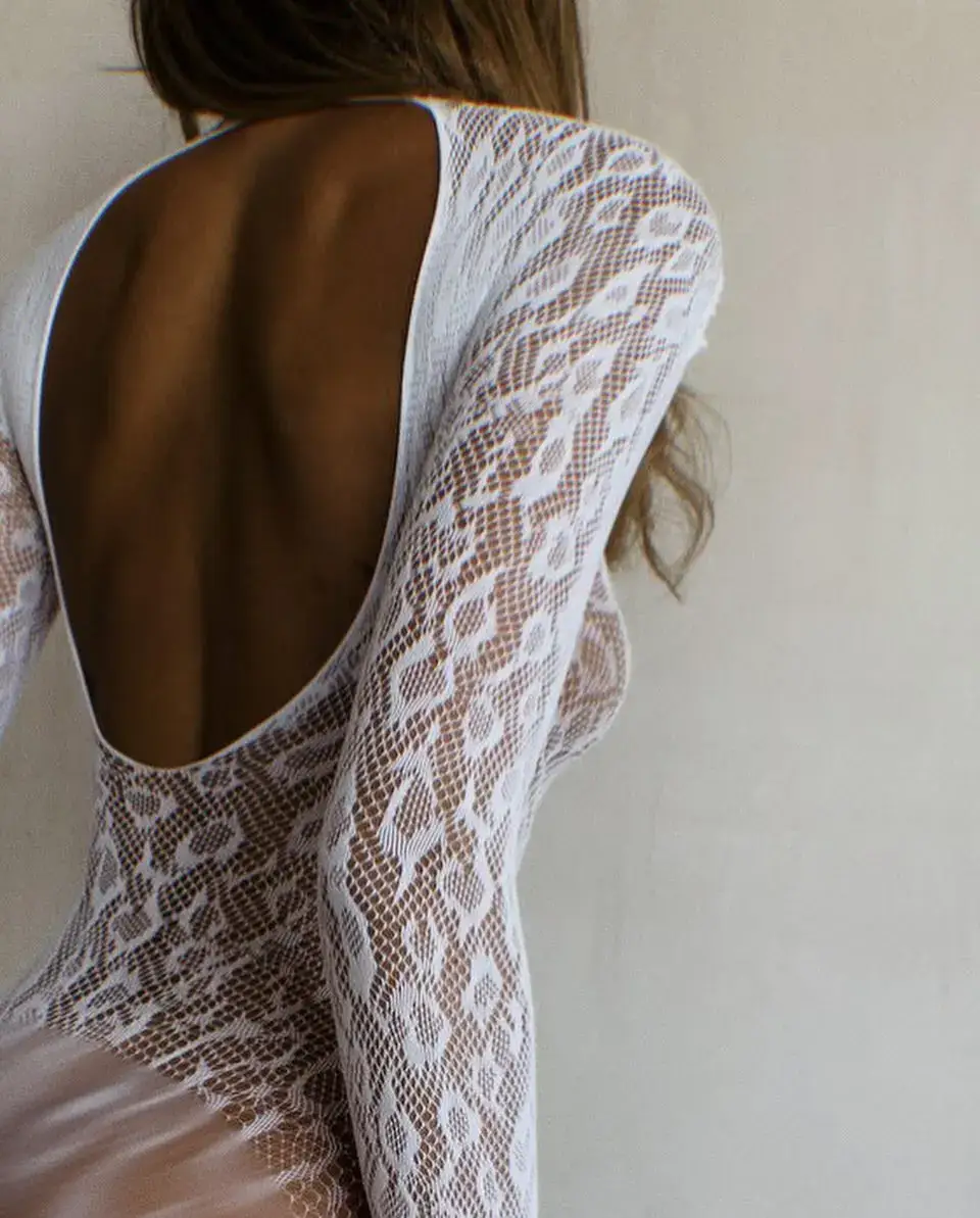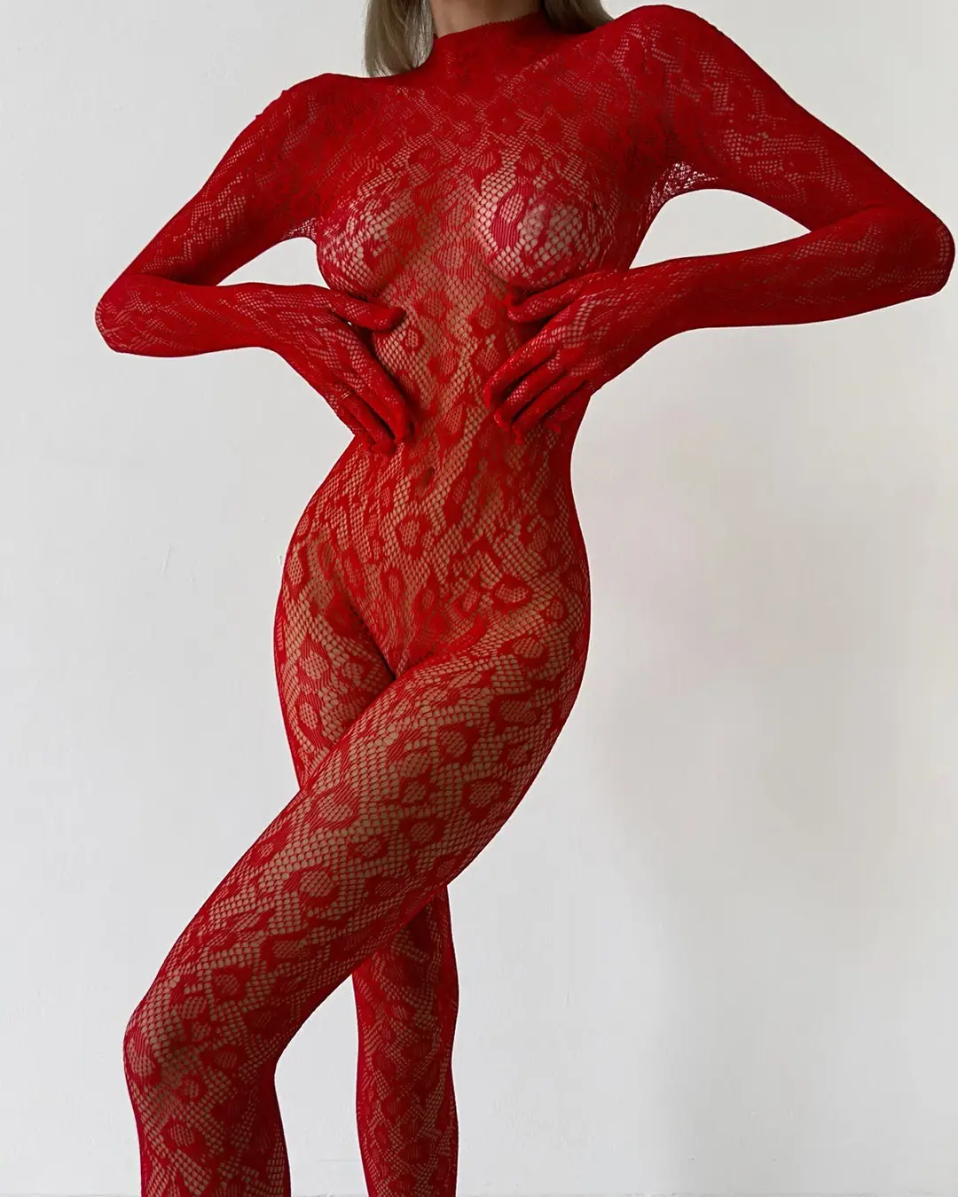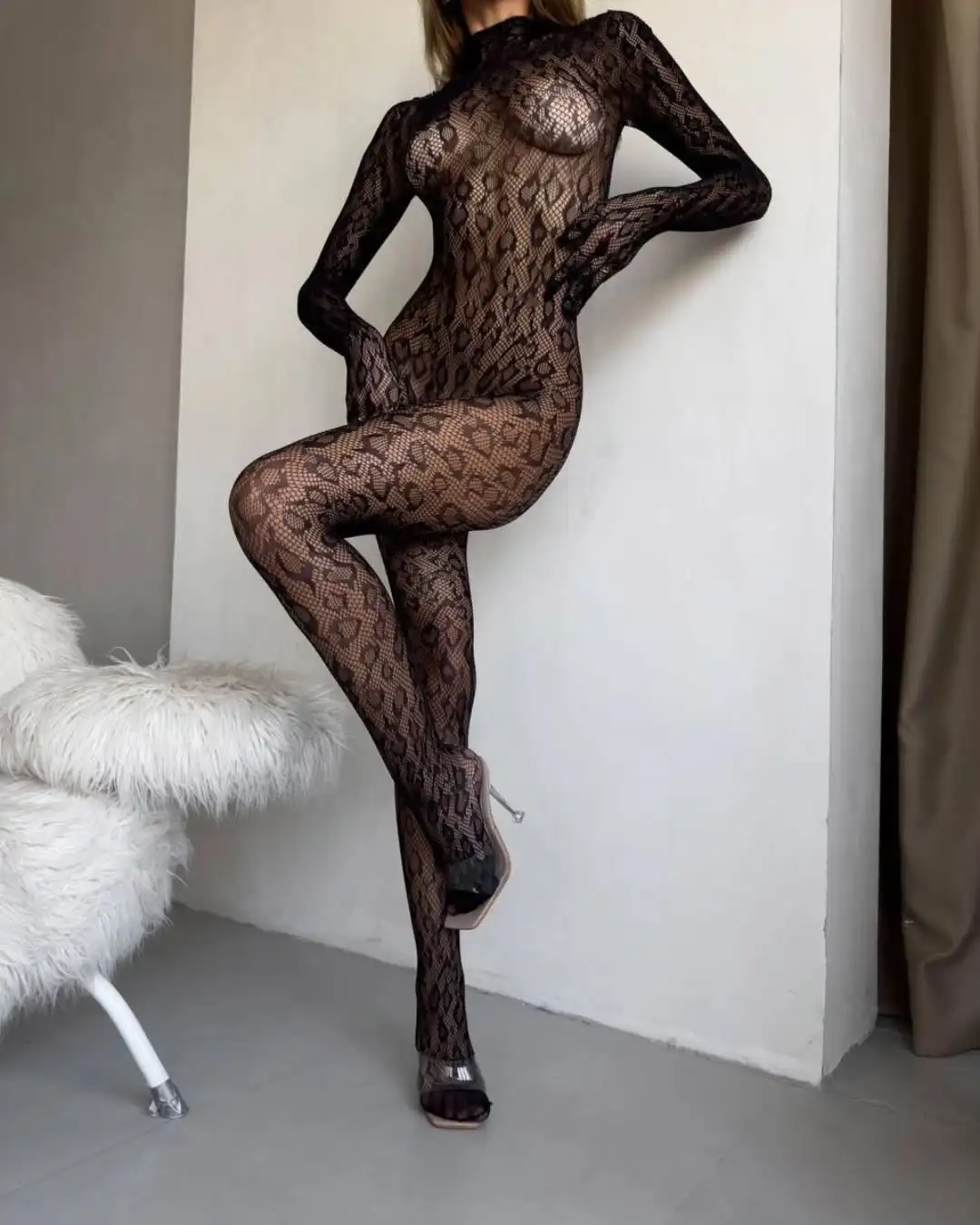 Ellolace Black Lace Bodystocking features an intricate snake-pattern floral lace interwoven with fine mesh, creating a richly layered, semi-sheer visual effect. The dramatically deep open back extends from the nape all the way to the hips, beautifully exposing and accentuating the back curve, while long sleeves and full-leg coverage elongate the entire silhouette for a taller, slimmer appearance.