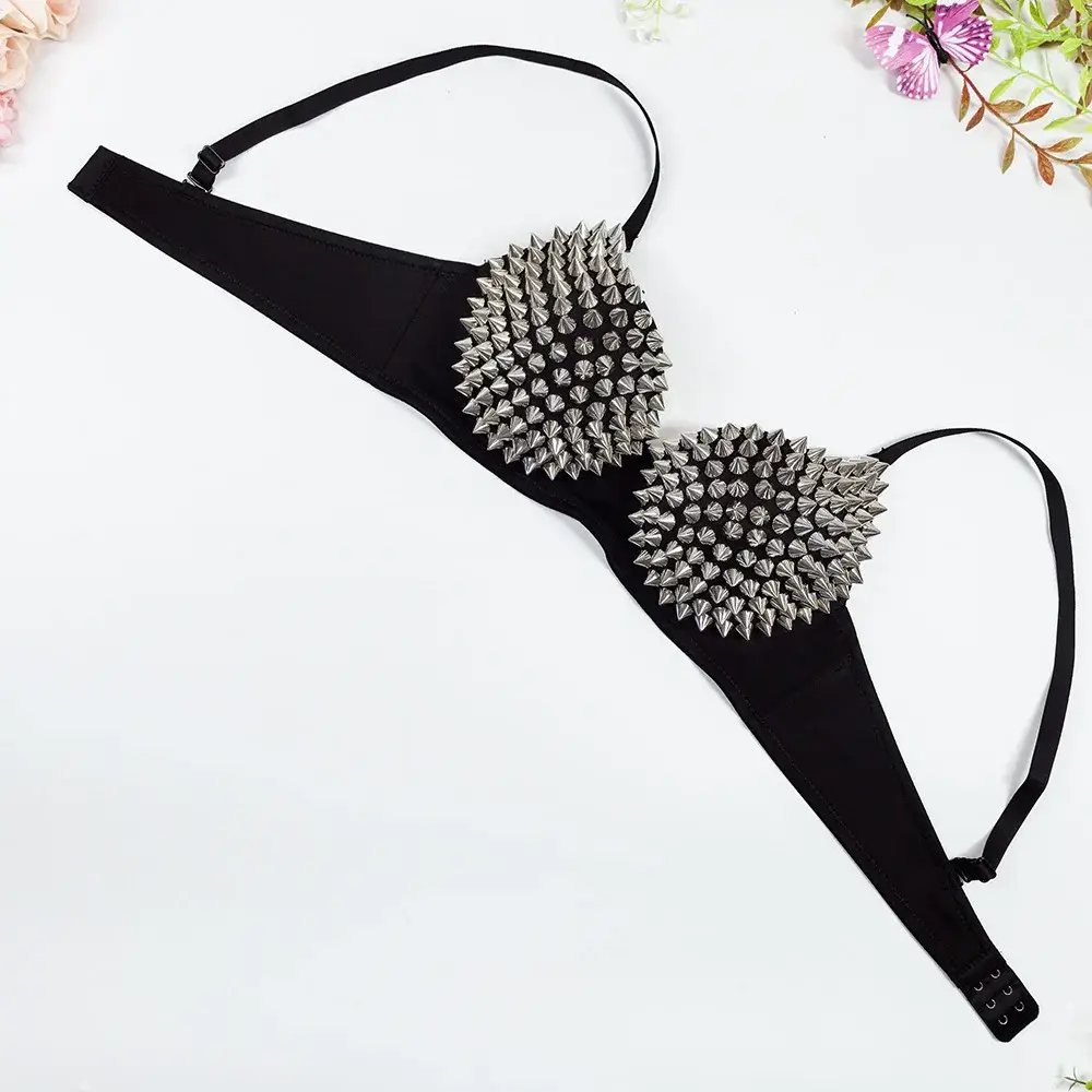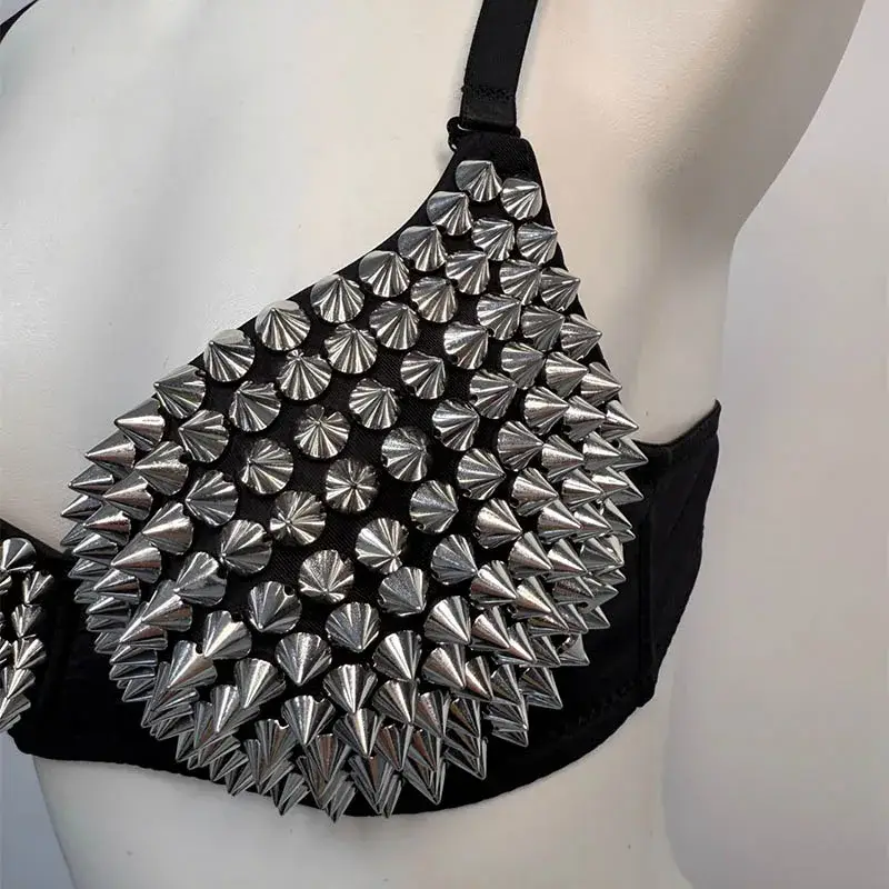 Command attention with this edgy spiked stud bra – a bold fusion of sleek black fabric and shimmering silver metallic spikes that cover the cups in a fierce, eye-catching pattern. The dramatic rivet design delivers instant rockstar energy, perfect for turning heads at parties, performances, or intimate moments when you want to embrace your rebellious side.