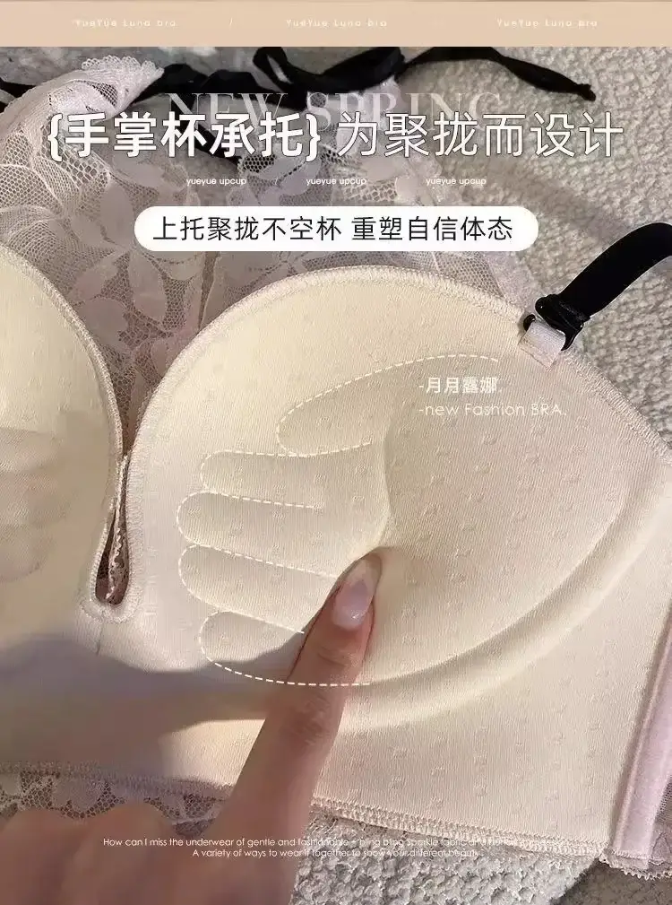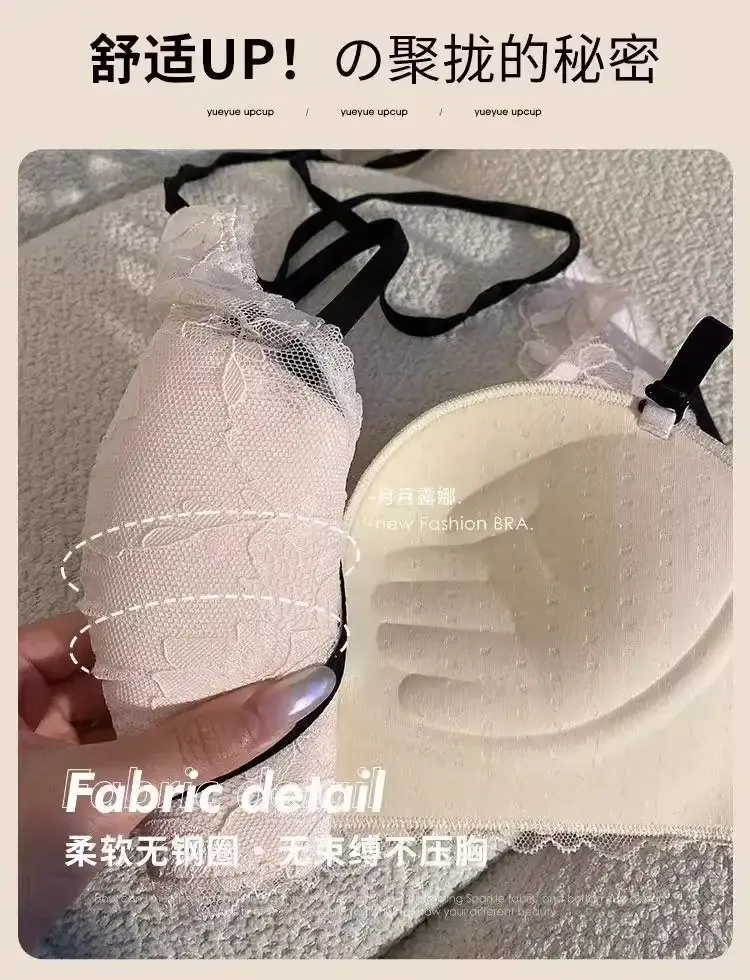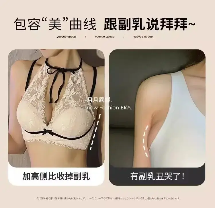 YueYue Luna Halter Lace Bralette combines delicate floral lace with a luxurious velvet bow, creating a perfect blend of softness and sensuality. Despite being completely wireless, it delivers impressive gathering and lift – ideal for smaller busts or anyone tired of empty cups, giving a fuller, more natural shape.