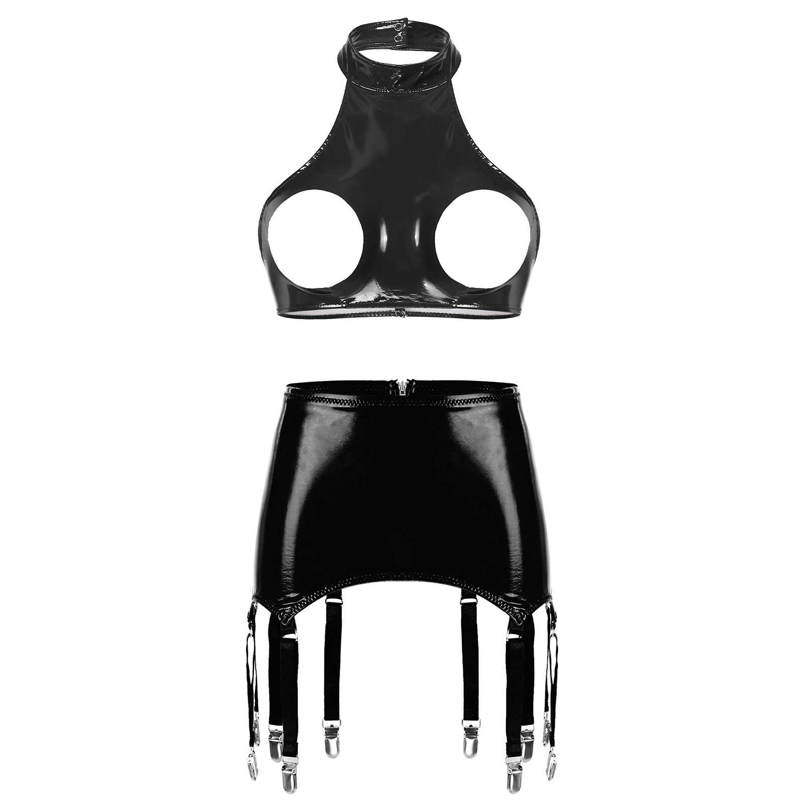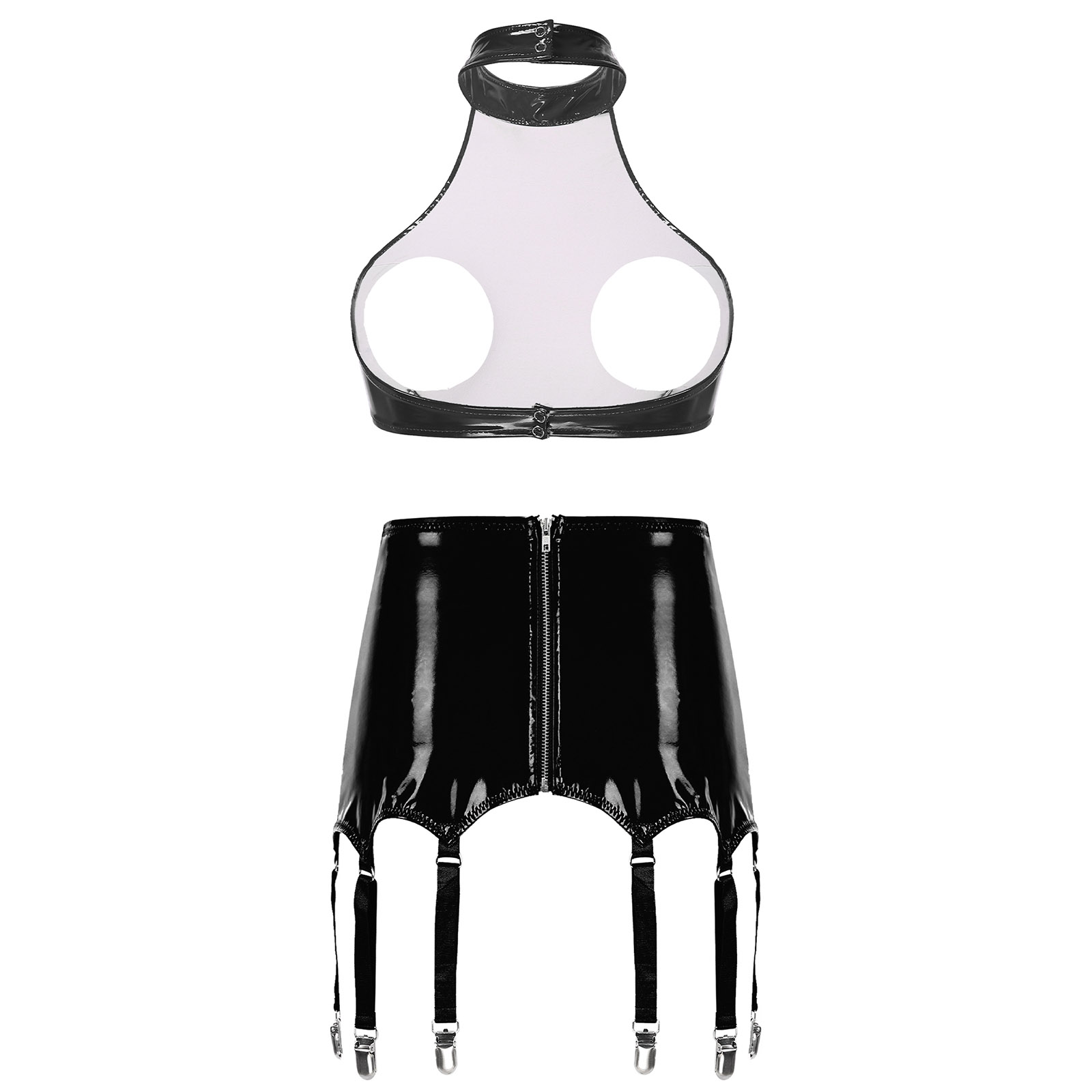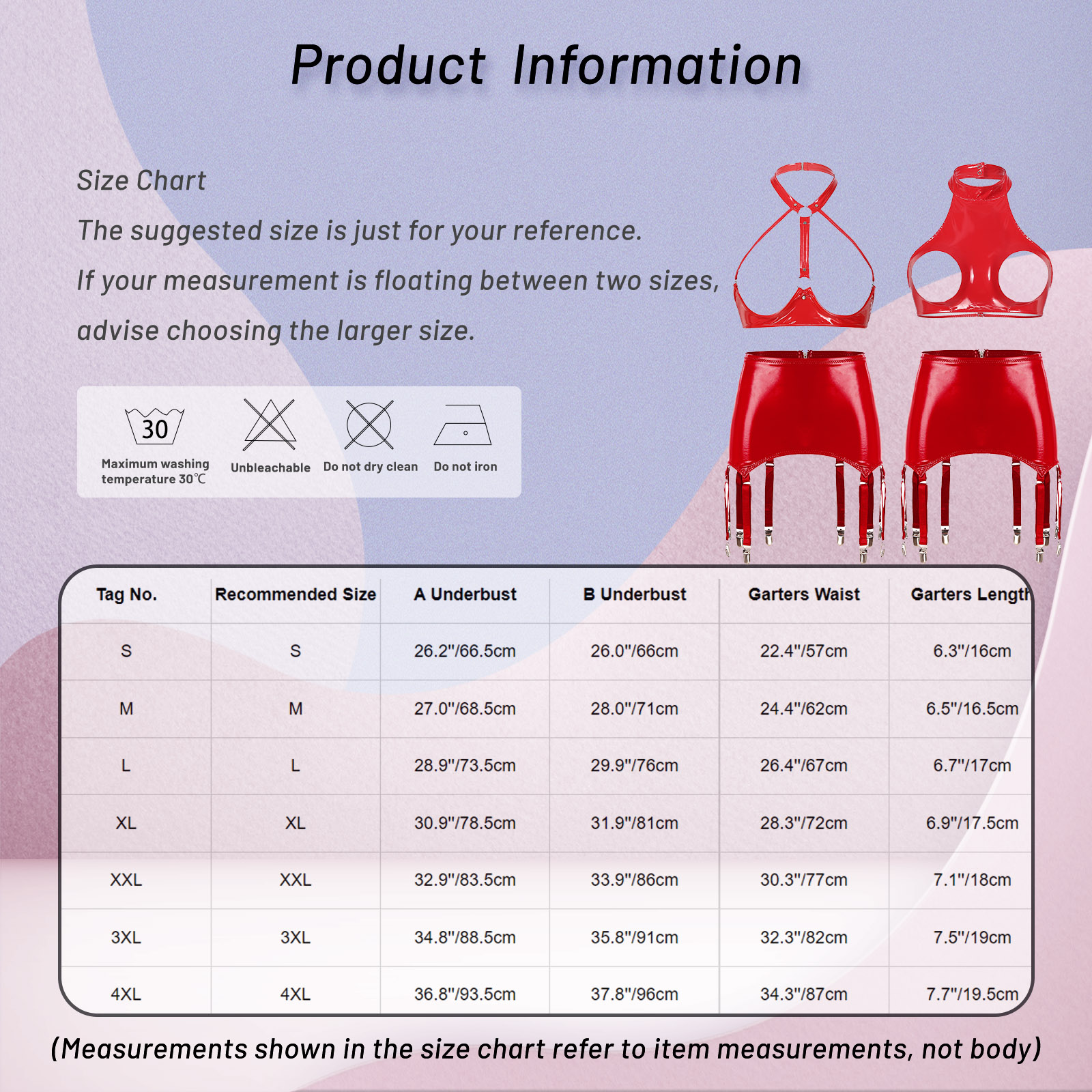 This YZYif patent leather open-cup garter set is made from premium high-shine patent leather — glossy, soft, and skin-friendly for ultimate luxury feel. The high-neck hollow bra top features full open-cup, wire-free design to boldly showcase natural curves; the mini skirt has rear zipper for easy wear, while multiple metal garters with clips securely hold stockings — blending restraint and tease for powerful queen dominance and taboo allure. Available in black/red/transparent colors, perfect for light to medium BDSM play, queen/slave role-play, couple erotic parties, wedding nights, honeymoons, Valentine’s Day, anniversaries, or intimate surprises. Discreet, unmarked packaging with no explicit wording ensures complete privacy. Whether as a sizzling gift or your mirror-front wild release piece, ignite ultimate passion and dominance!