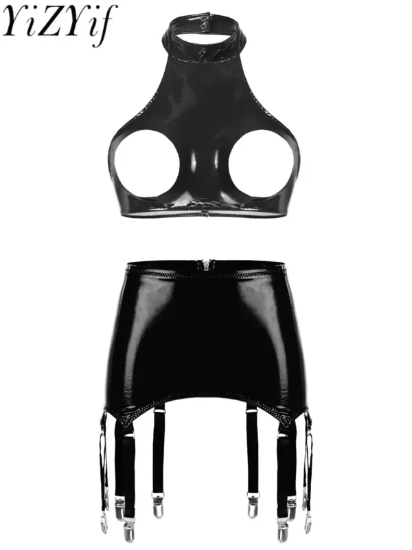This YZYif patent leather open-cup garter set is made from premium high-shine patent leather — glossy, soft, and skin-friendly for ultimate luxury feel. The high-neck hollow bra top features full open-cup, wire-free design to boldly showcase natural curves; the mini skirt has rear zipper for easy wear, while multiple metal garters with clips securely hold stockings — blending restraint and tease for powerful queen dominance and taboo allure. Available in black/red/transparent colors, perfect for light to medium BDSM play, queen/slave role-play, couple erotic parties, wedding nights, honeymoons, Valentine’s Day, anniversaries, or intimate surprises. Discreet, unmarked packaging with no explicit wording ensures complete privacy. Whether as a sizzling gift or your mirror-front wild release piece, ignite ultimate passion and dominance!